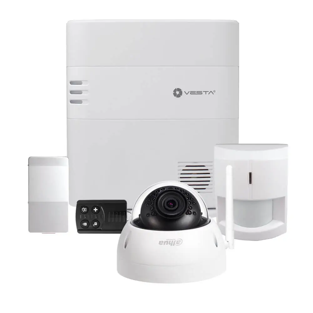Kit VESTA 2G que incluye: 1x VESTA-046 (HSGW-G8-2G-F1-ZW): Central IP Ethernet + 2G de seguridad para el hogar de 160 zonas vía radio. Grado 2. 1x VESTA-009 (IR-29SL-F1): Detector PIR vía radio. Grado 2. 1x VESTA-013 (MDC-3-F1): Contacto magnético vía radio. Grado 2. 1x VESTA-014 (RC-16-F1): Pulsador vía radio de 4 botones. Grado 2. 1x DAHUA-621-FO (IPC-HDBW1320E-W): Domo fijo IP serie PRO con WIFI e iluminación IR de 30 m antivandálico para exterior.